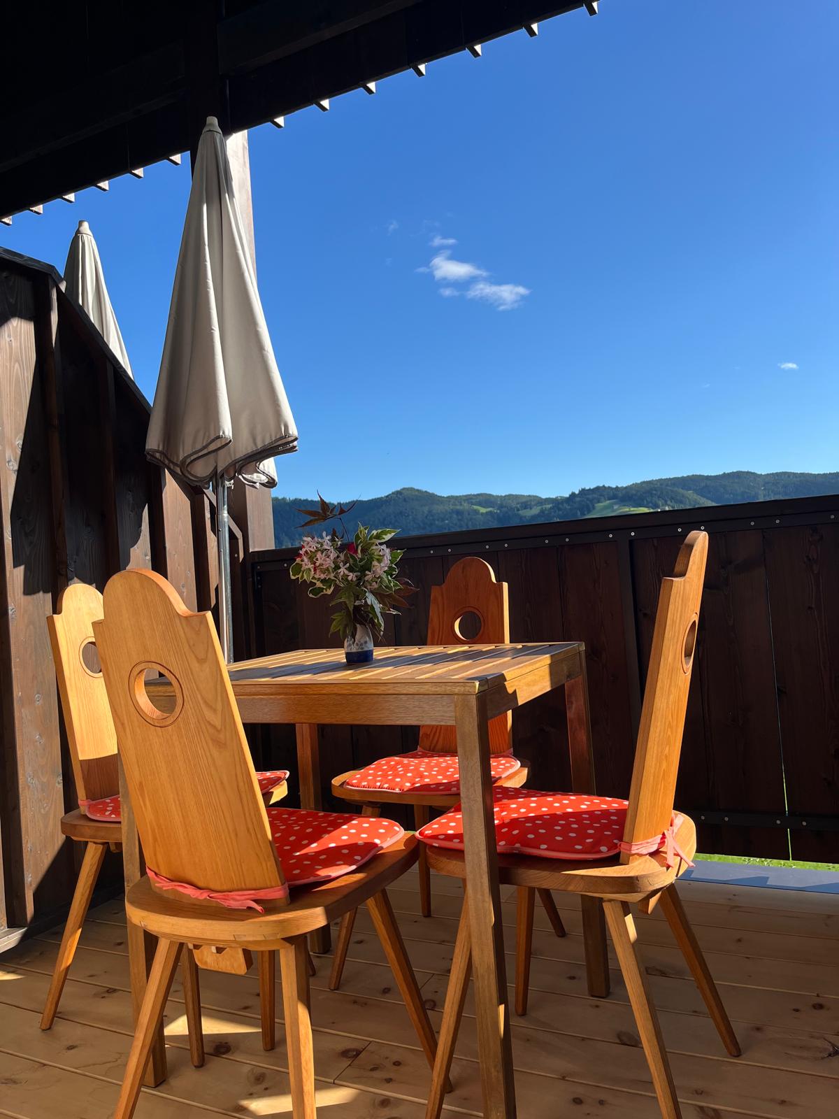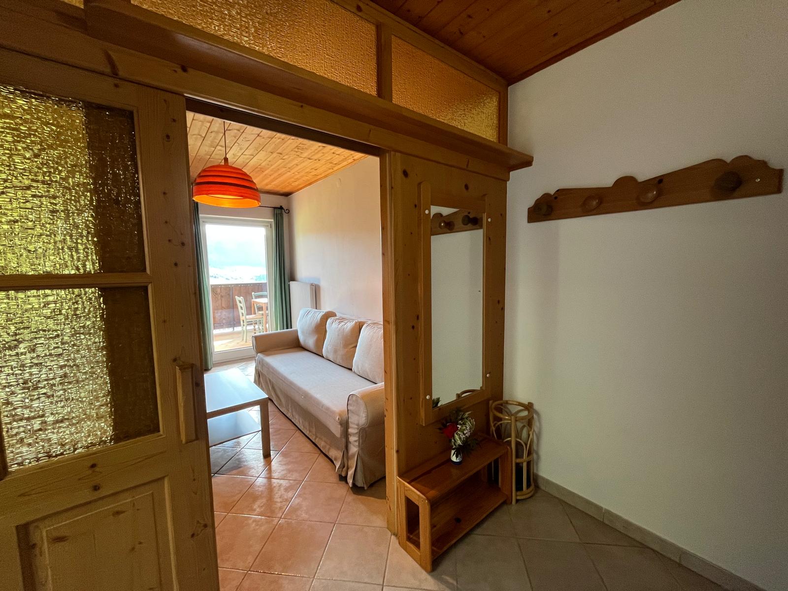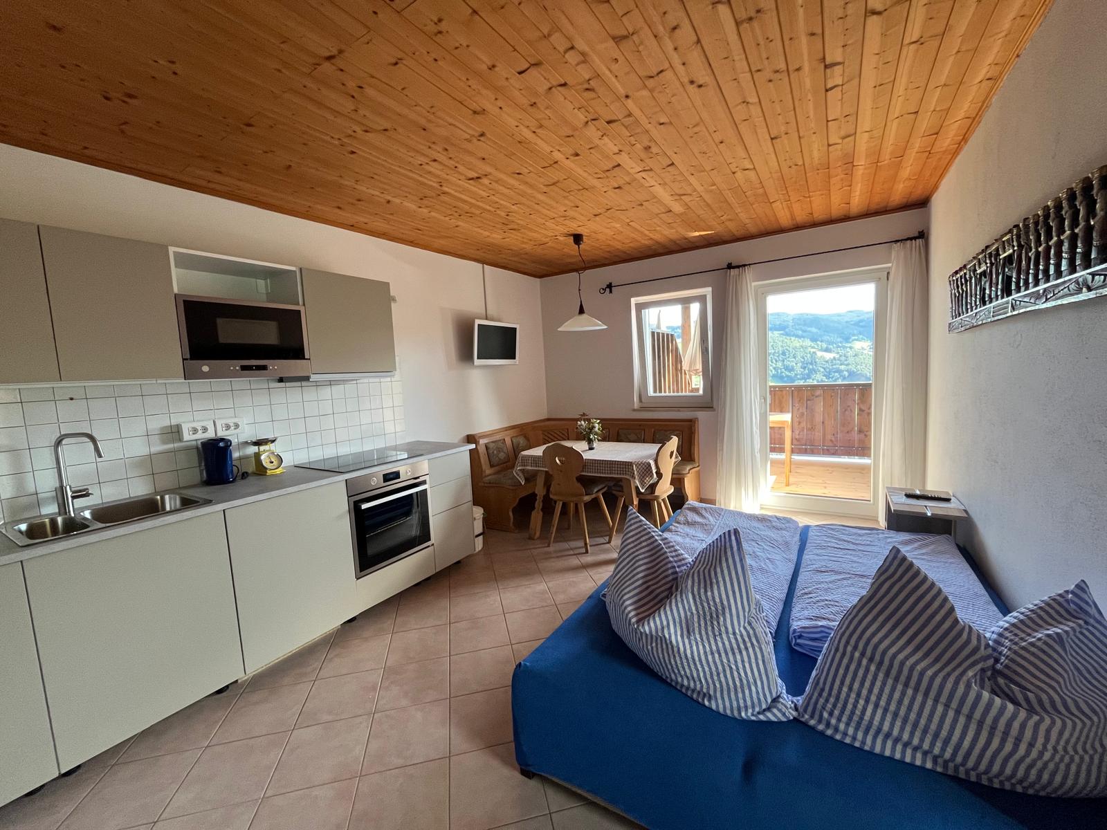 Die Wohnung Hammerwand befindet sich im 1. Stock und verfügt über eine Wohnküche, 1 Schlafzimmer mit Doppelbett, 1 Bad mit Dusche und WC und einen Balkon mit Klapptisch, Stühlen und einem Sonnenschirm, alles in Südausrichtung und mit Talblick. Die Wohnung verfügt im Wohnraum über ein Doppelbett-Schlafsofa.Wohnung Schlern