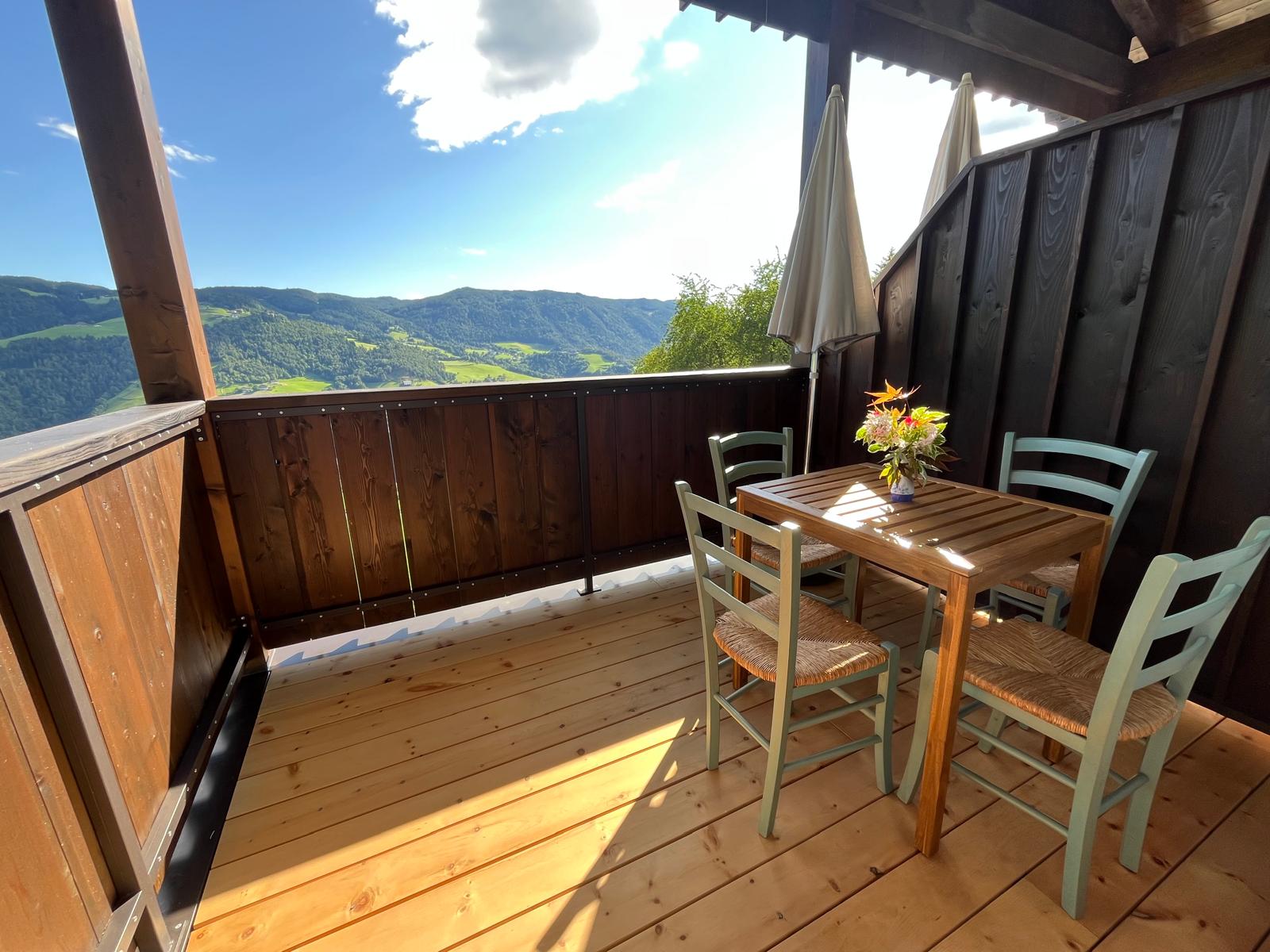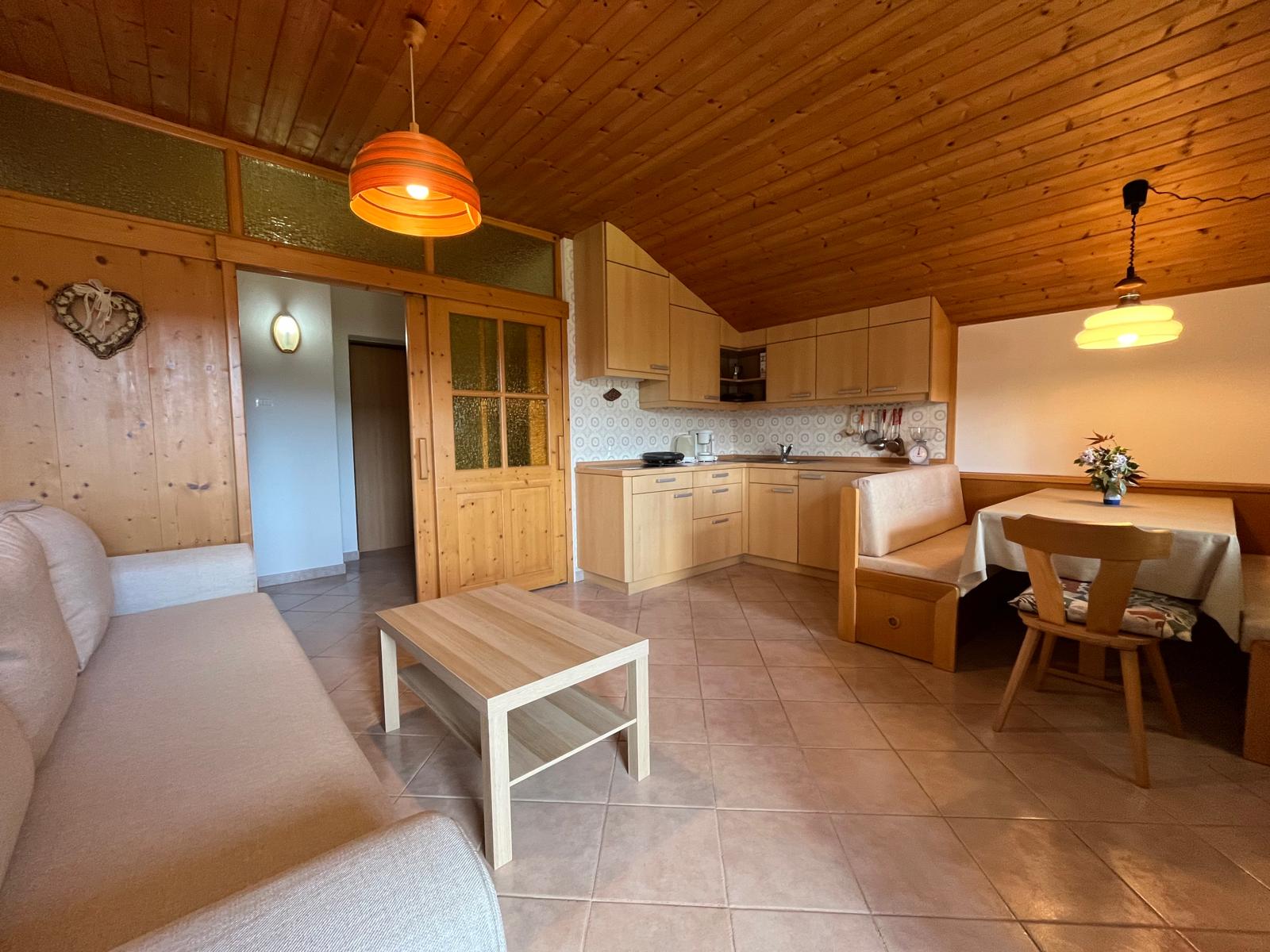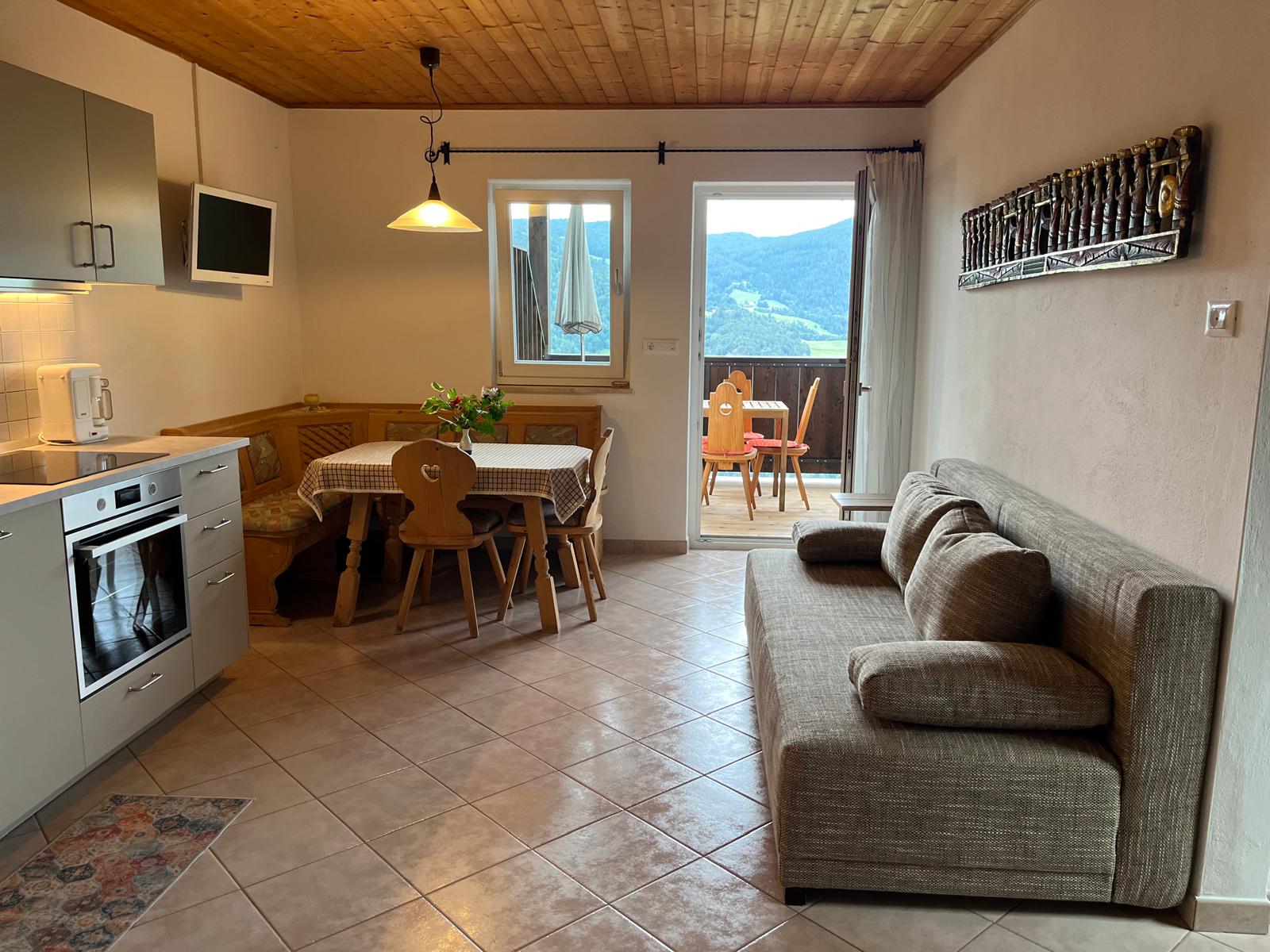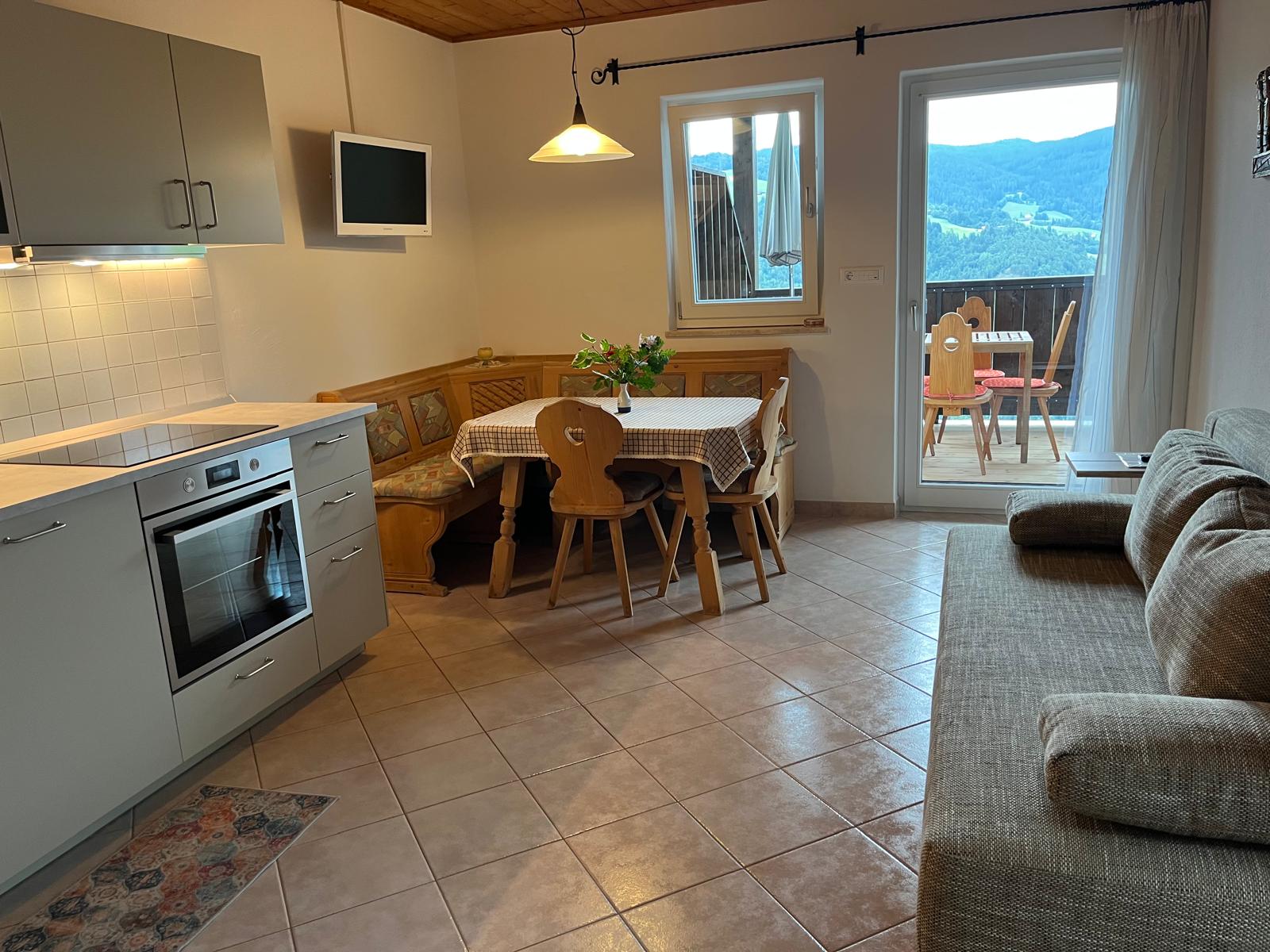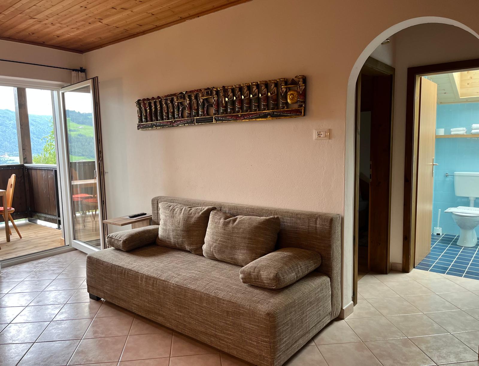 Die Wohnung Schlern befindet sich im 1. Stock und verfügt über eine Wohnküche, 1 Schlafzimmer mit Doppelbett, 1 Bad mit Dusche und WC und einen Balkon mit Klapptisch, Stühlen und einem Sonnenschirm, alles in Südausrichtung und mit Talblick. Die Wohnung verfügt im Wohnraum über ein Doppelbett-Schlafsofa. Tages- und Nachtbereich sind mittels einer Schiebetür abtrennbar.Wohnung Latemar
