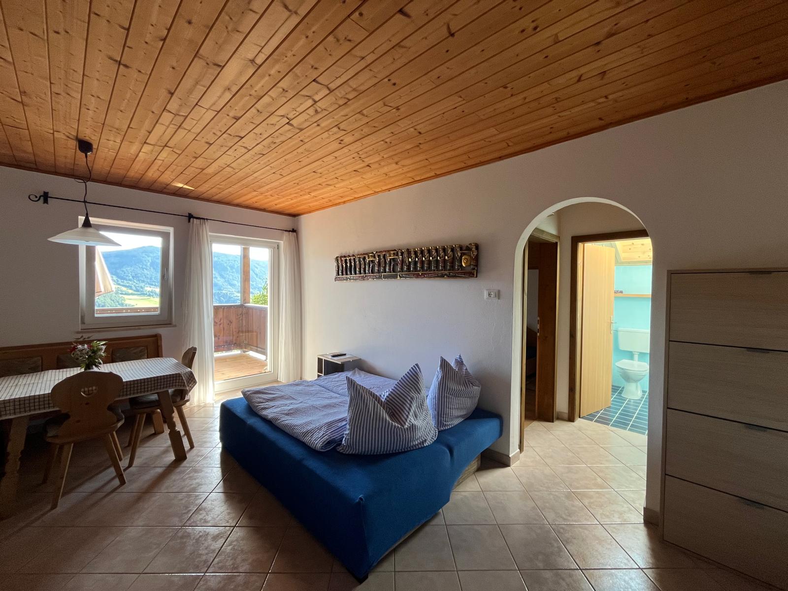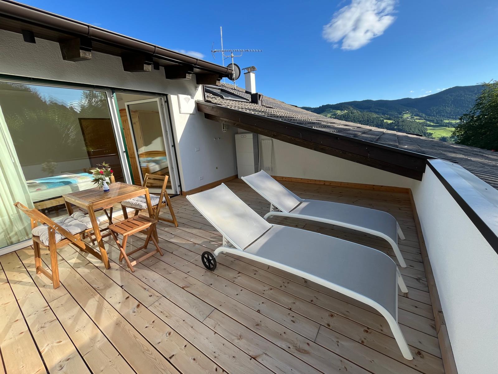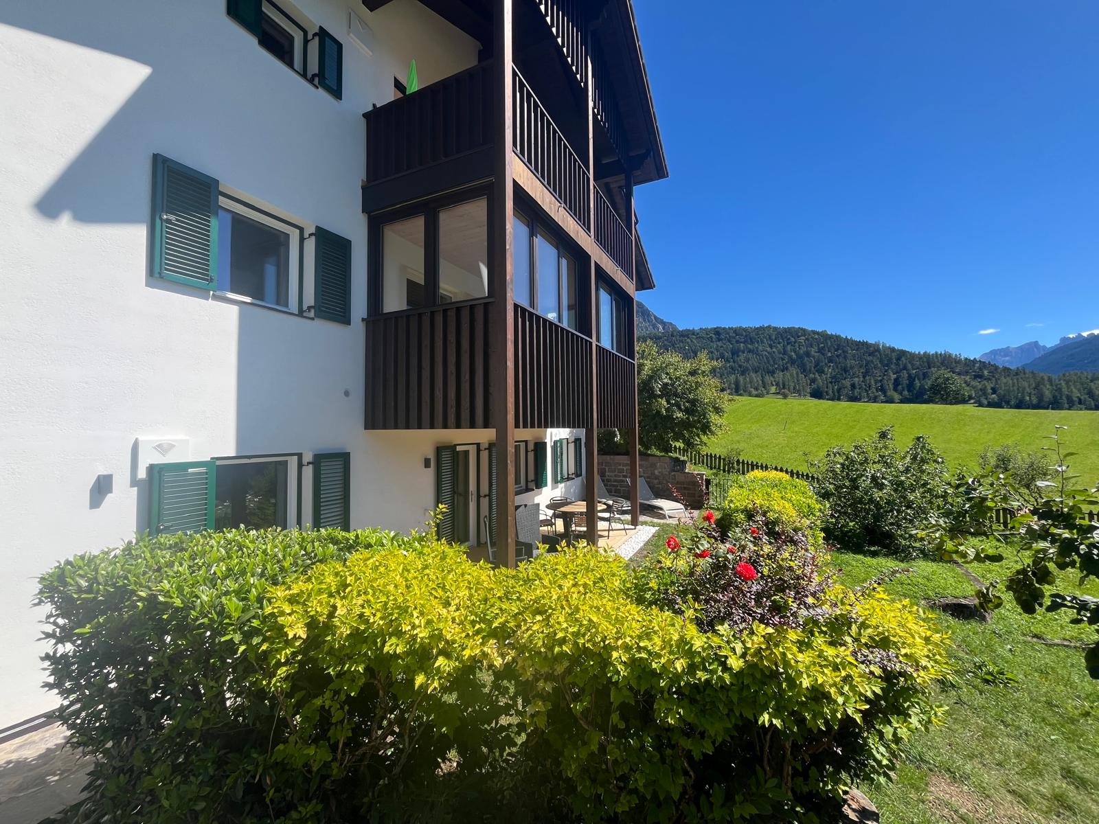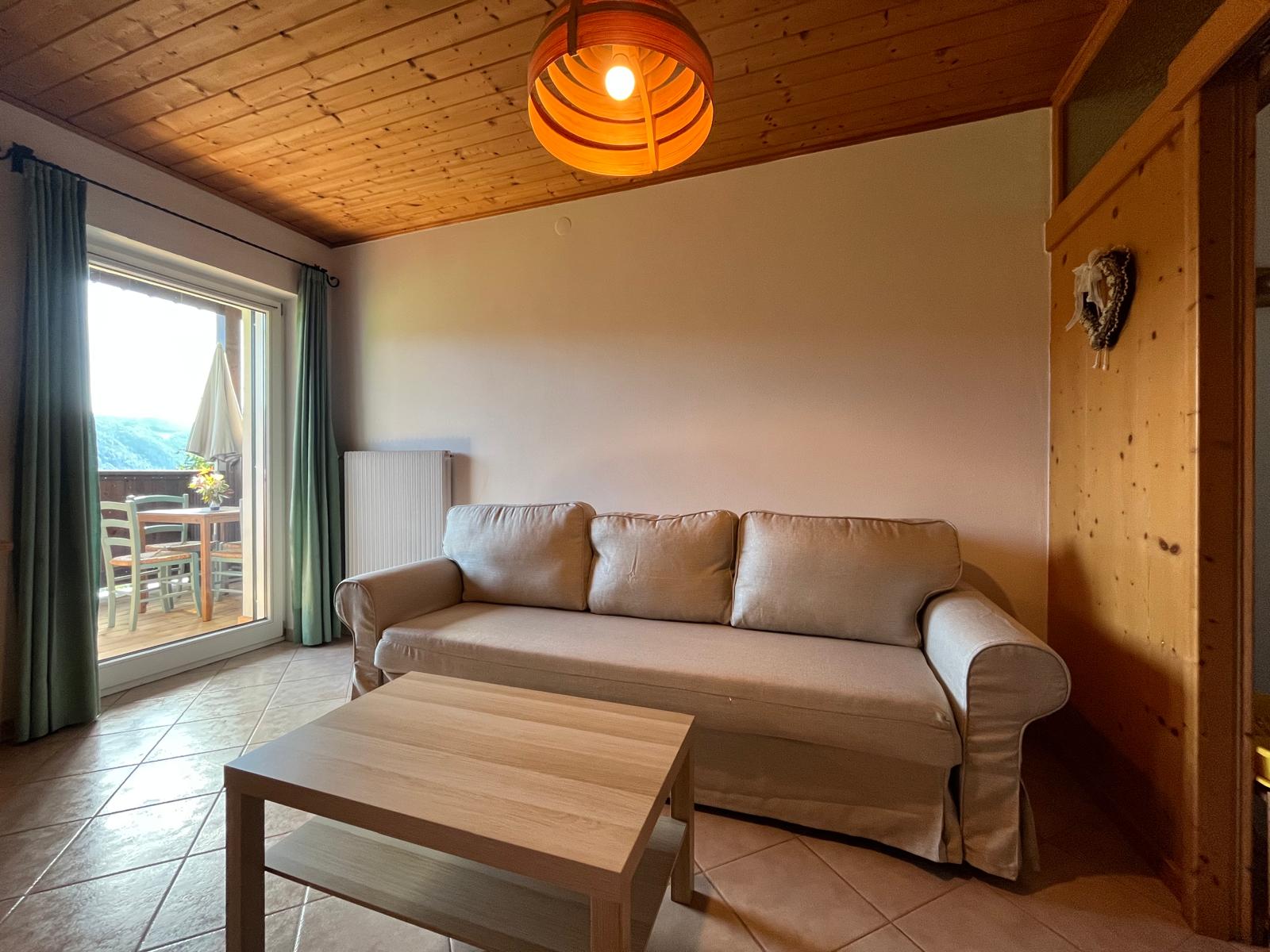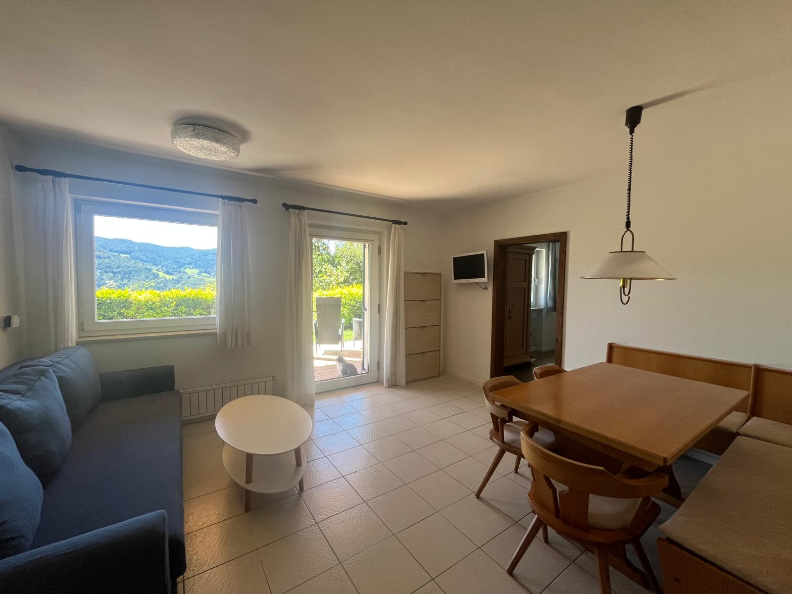 Die Wohnung Schlern befindet sich im 1. Stock und verfügt über eine Wohnküche, 1 Schlafzimmer mit Doppelbett, 1 Bad mit Dusche und WC und einen Balkon mit Klapptisch, Stühlen und einem Sonnenschirm, alles in Südausrichtung und mit Talblick. Die Wohnung verfügt im Wohnraum über ein Doppelbett-Schlafsofa. Tages- und Nachtbereich sind mittels einer Schiebetür abtrennbar.Wohnung Latemar