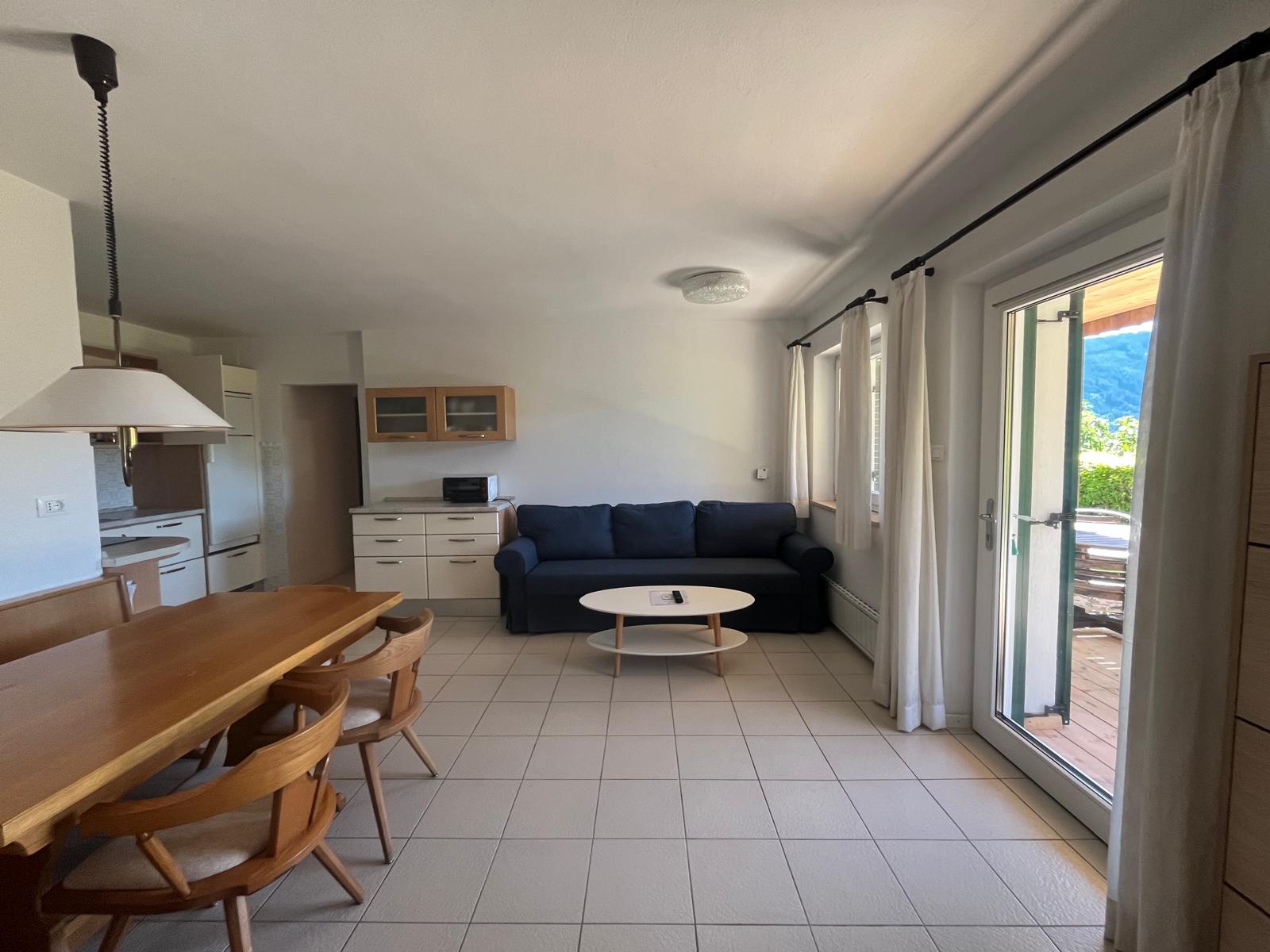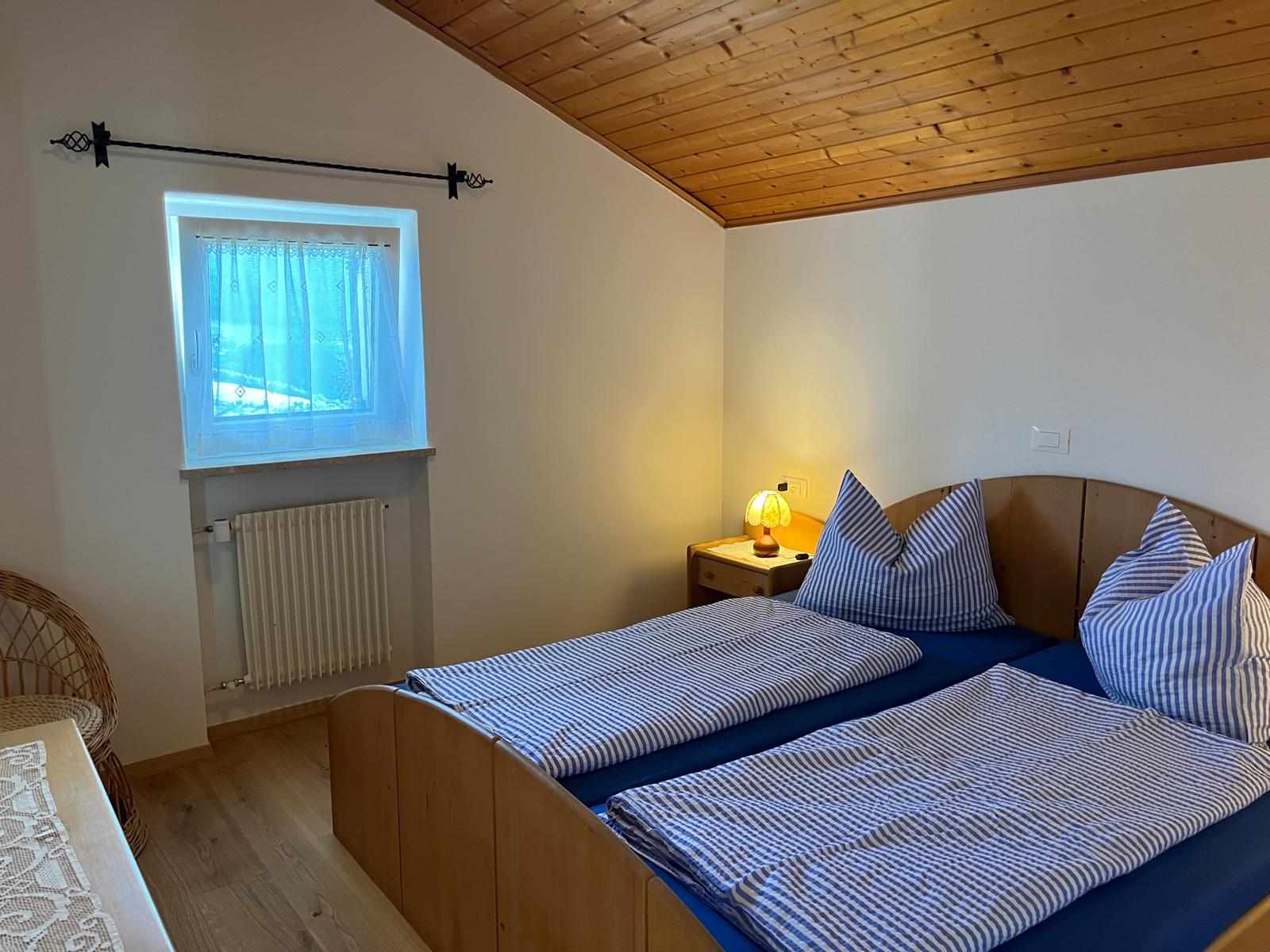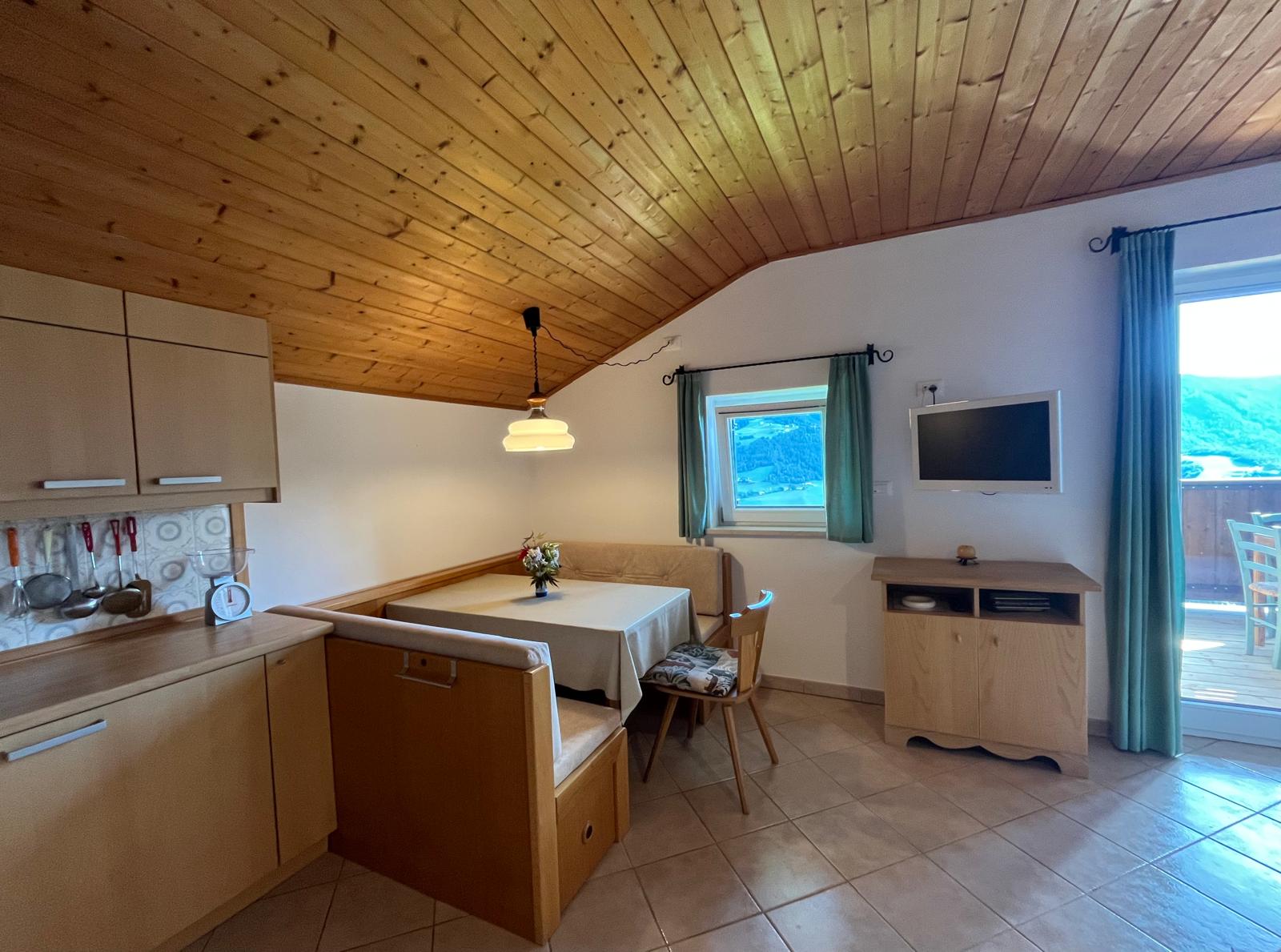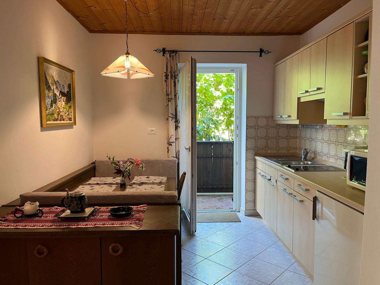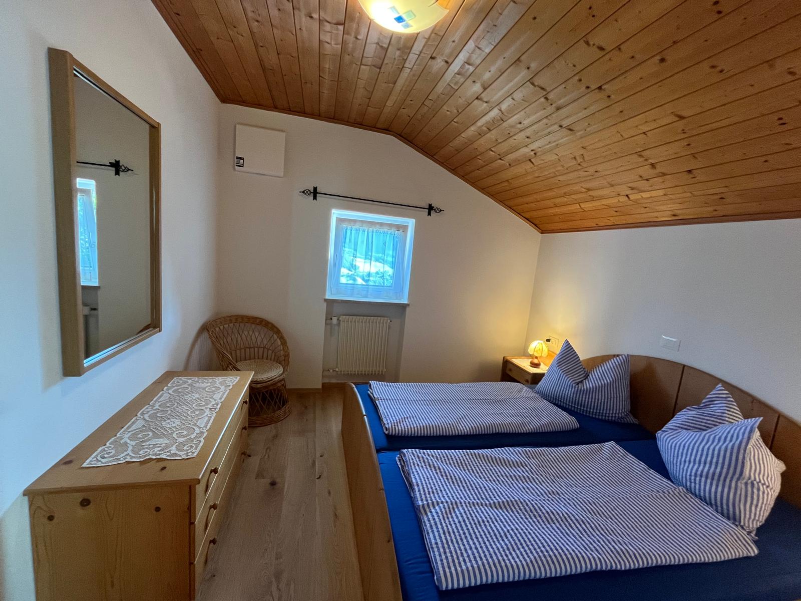 Die Wohnung Schlern befindet sich im 1. Stock und verfügt über eine Wohnküche, 1 Schlafzimmer mit Doppelbett, 1 Bad mit Dusche und WC und einen Balkon mit Klapptisch, Stühlen und einem Sonnenschirm, alles in Südausrichtung und mit Talblick. Die Wohnung verfügt im Wohnraum über ein Doppelbett-Schlafsofa. Tages- und Nachtbereich sind mittels einer Schiebetür abtrennbar.Wohnung Latemar
